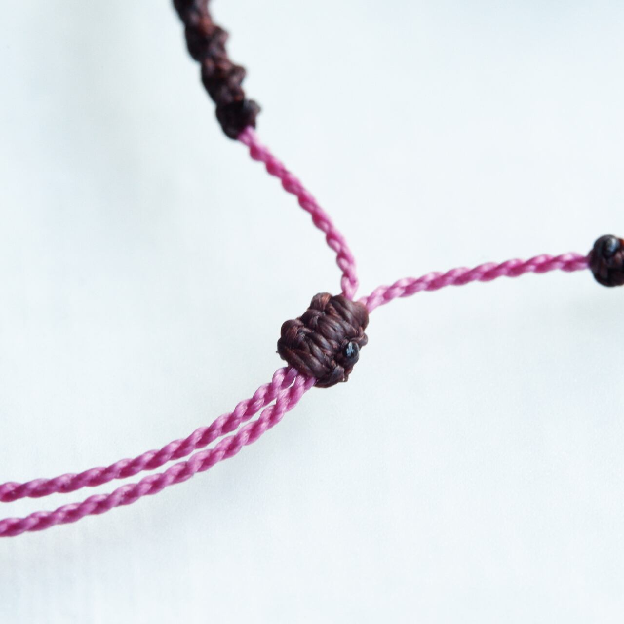 ルビーの色に合わせたローズピンクの紐を組み合わせ、