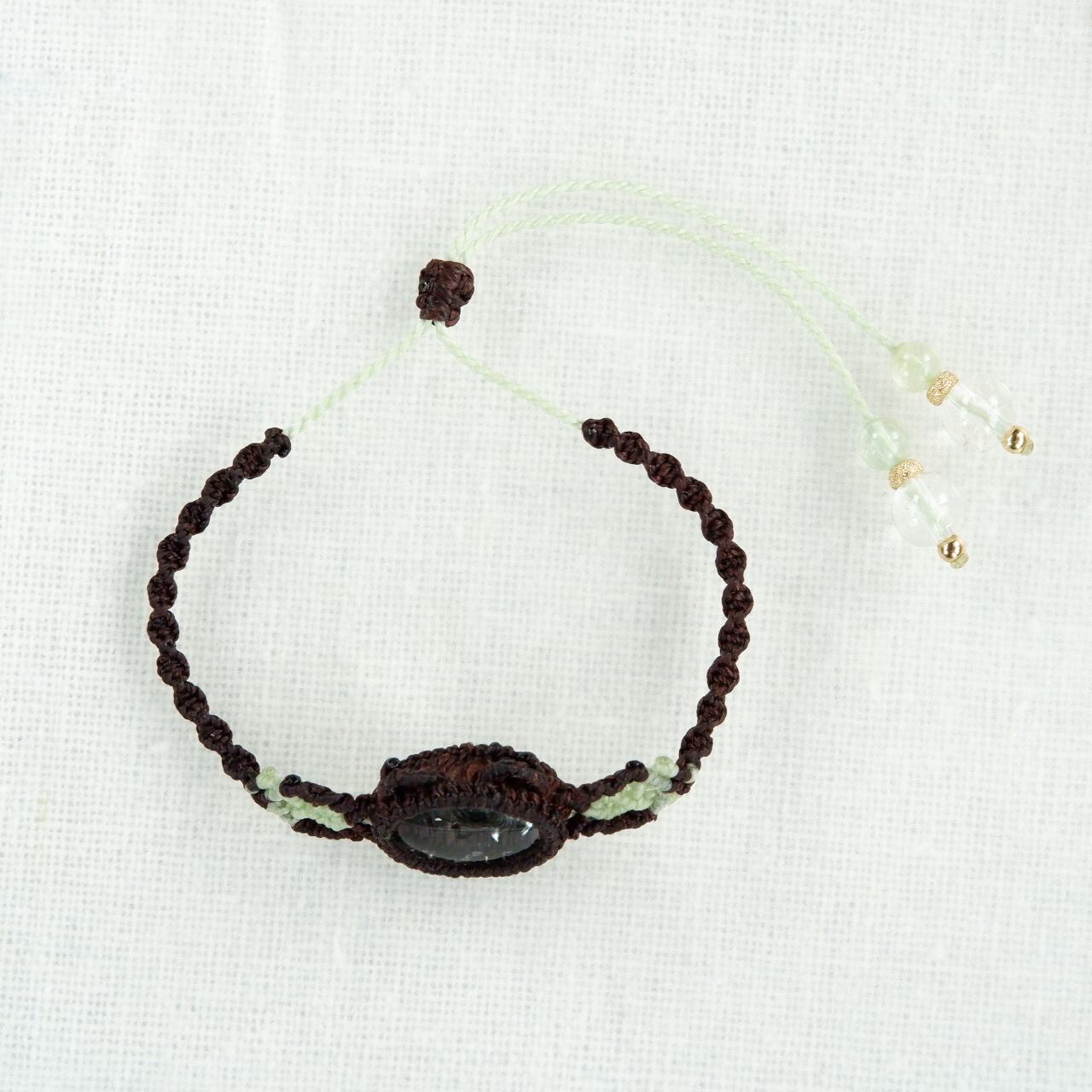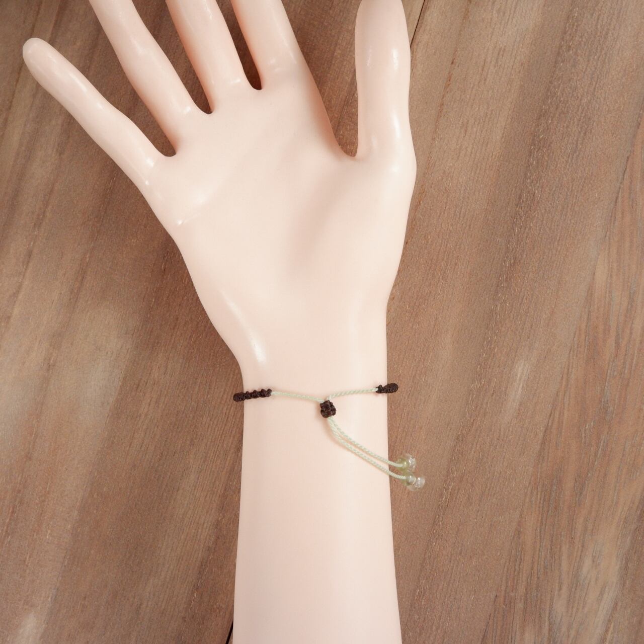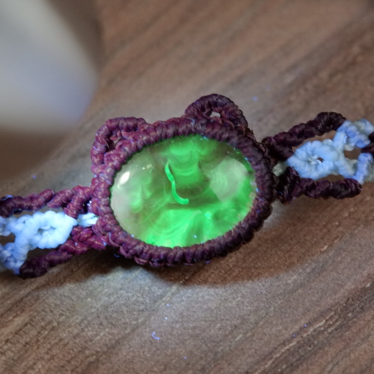 紐の端にも同じく蛍光するハイアライトオパールのビーズを使用しています。