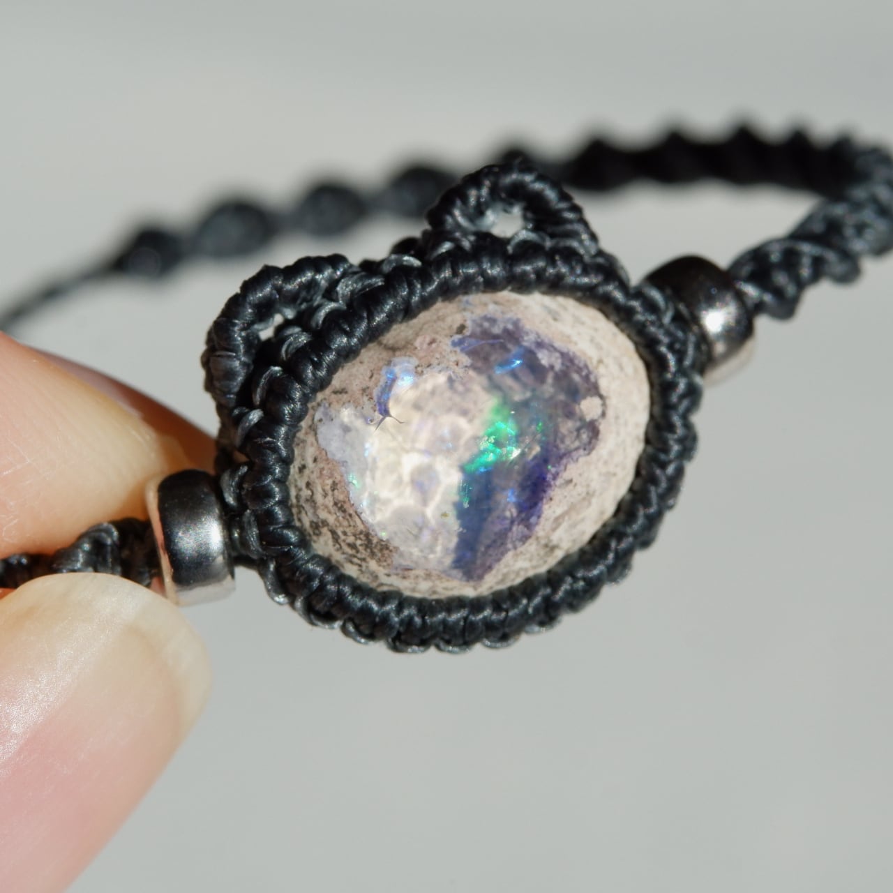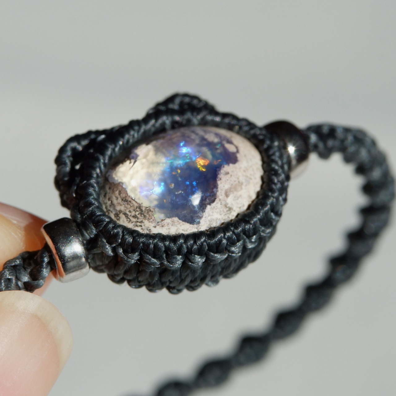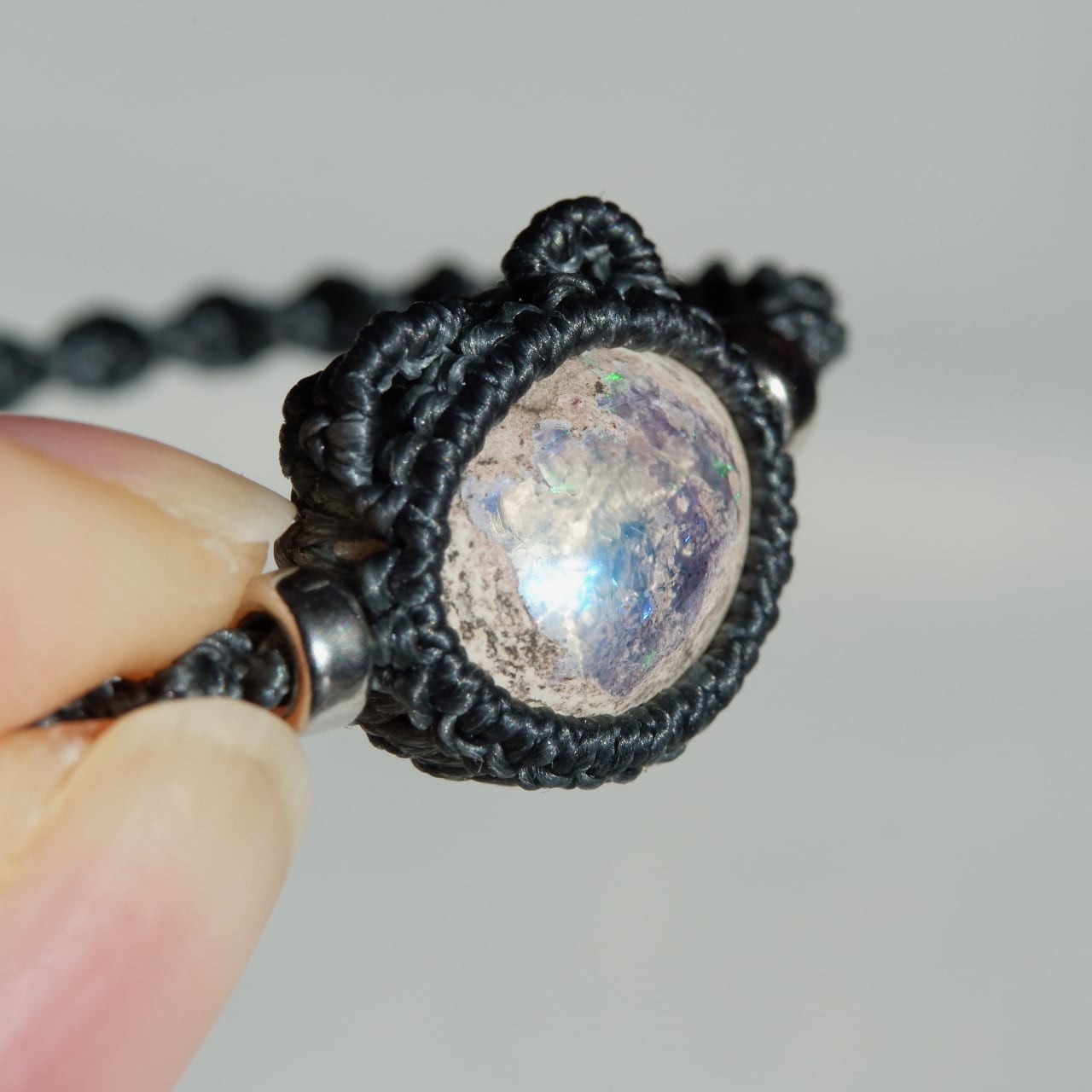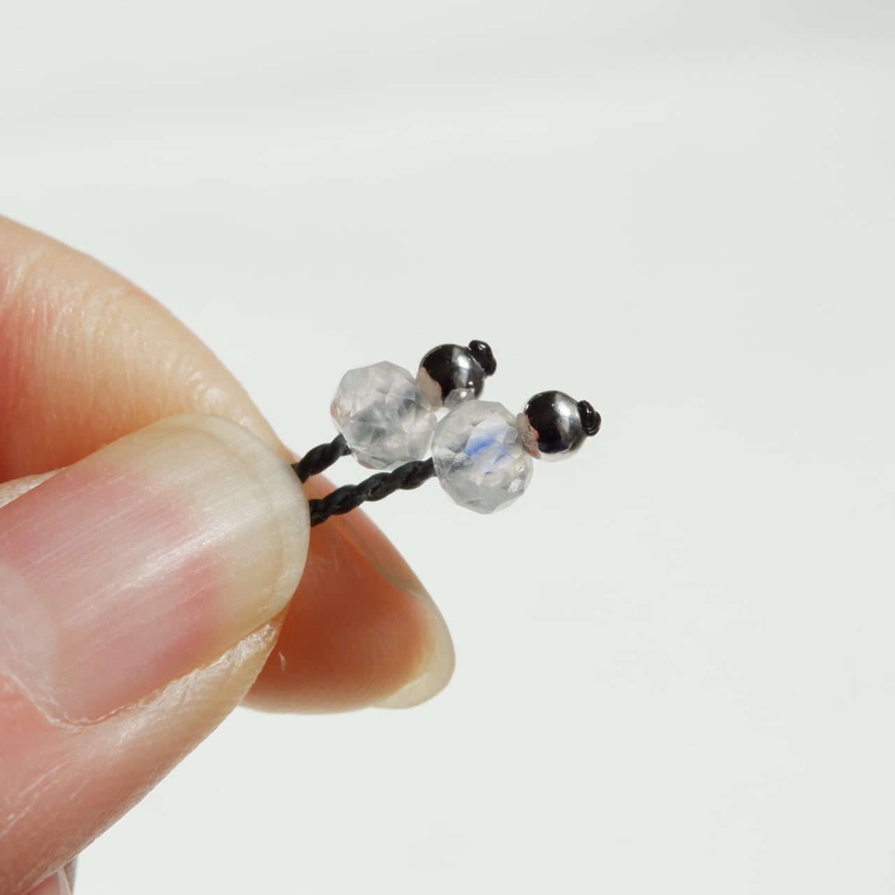 紐の端はカンテラオパールの雰囲気と似たホワイトラブラドライトを使用しました。
