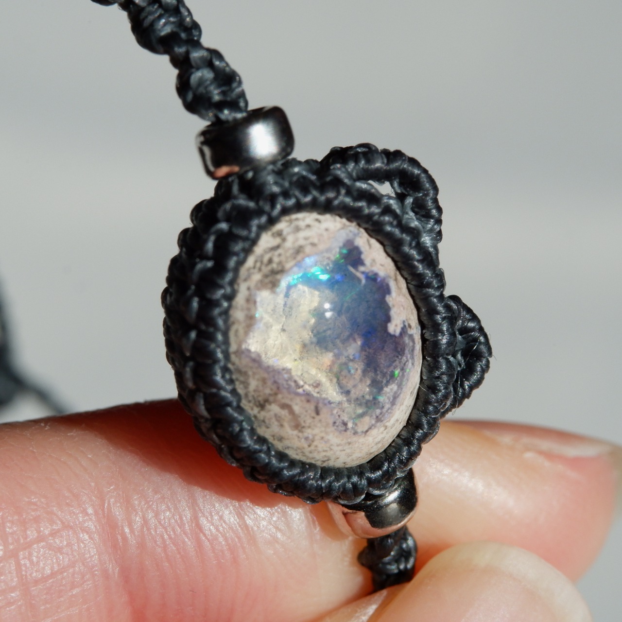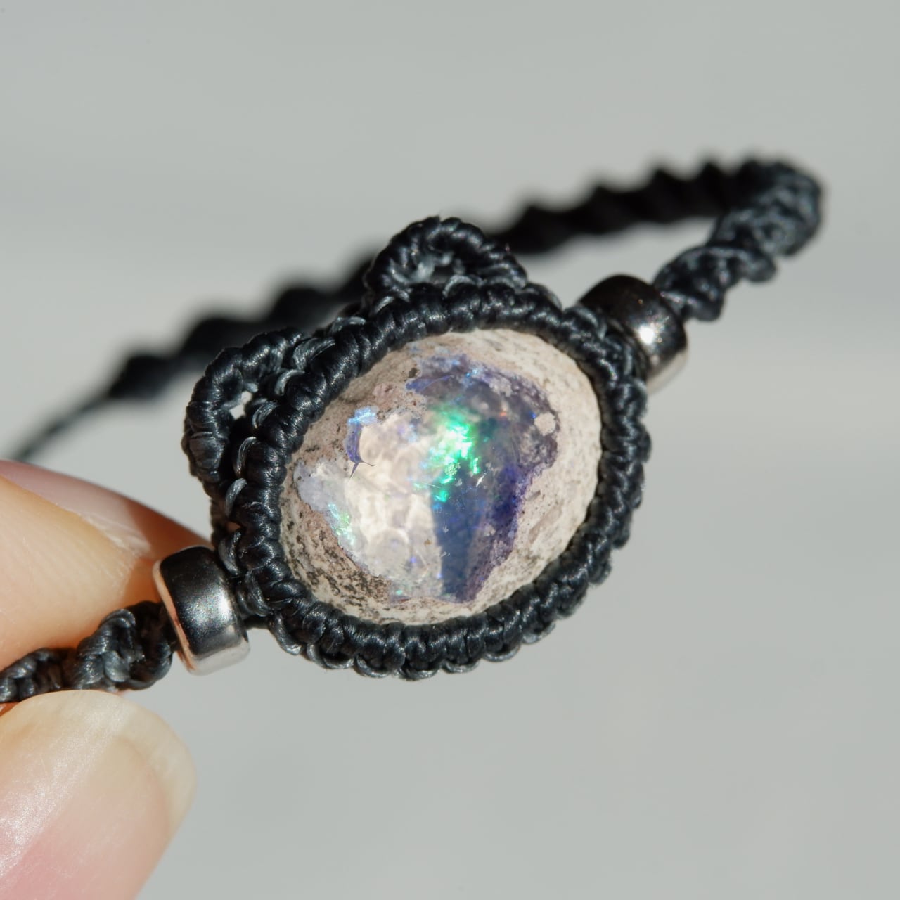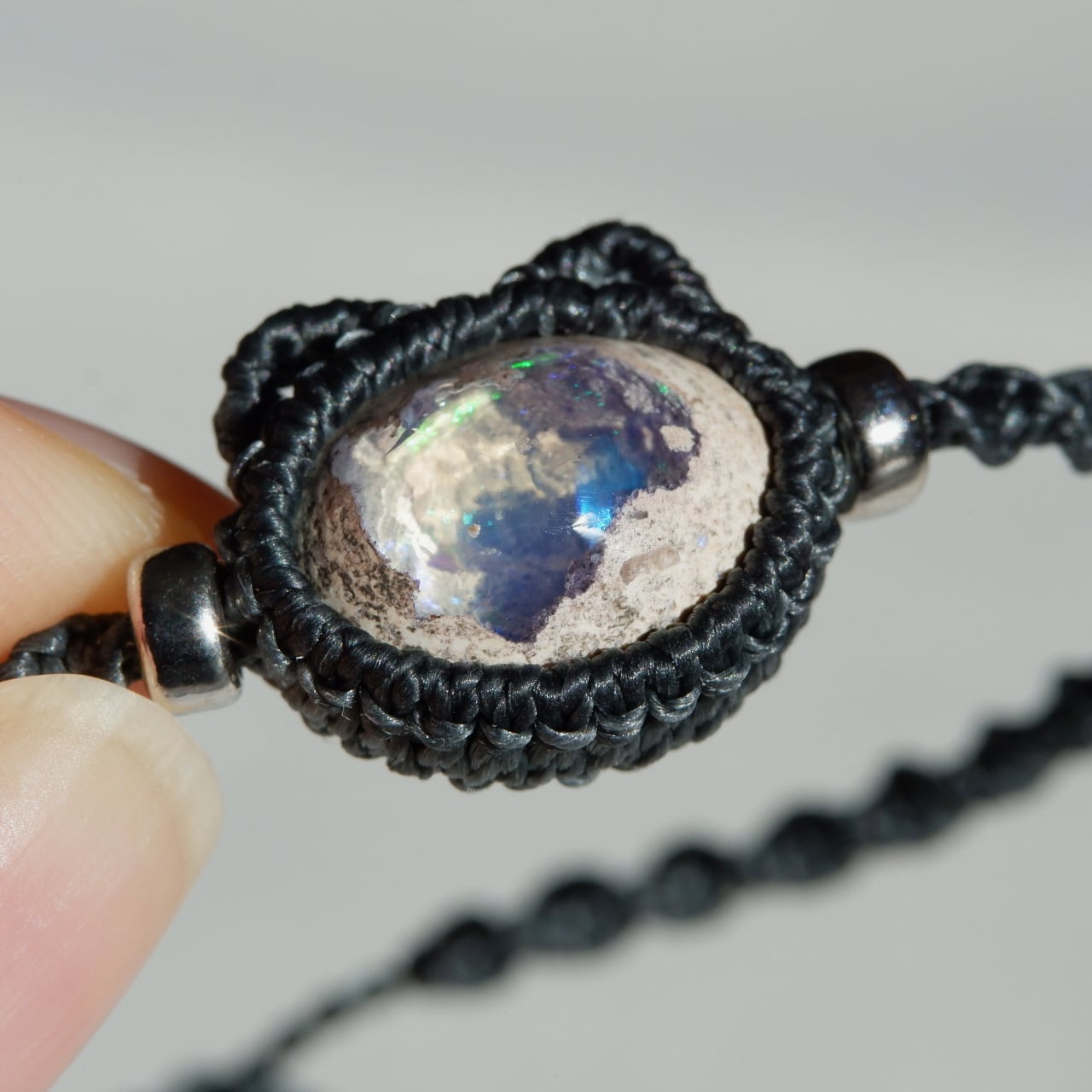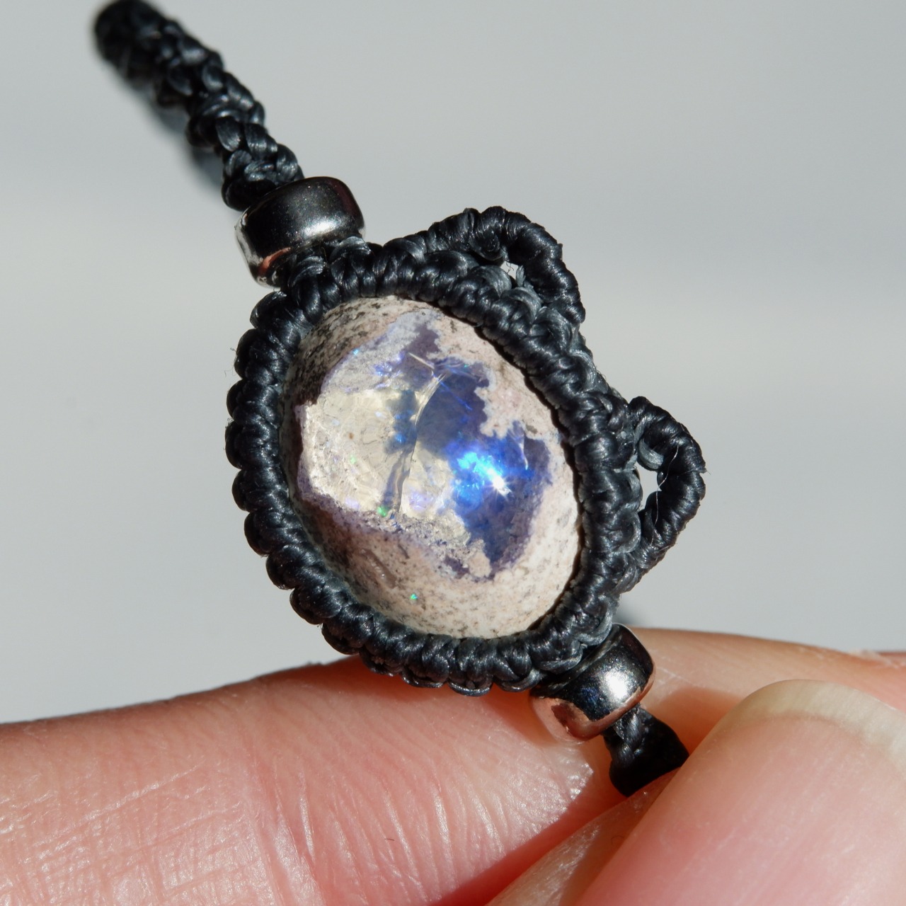 紐の端はカンテラオパールの雰囲気と似たホワイトラブラドライトを使用しました。