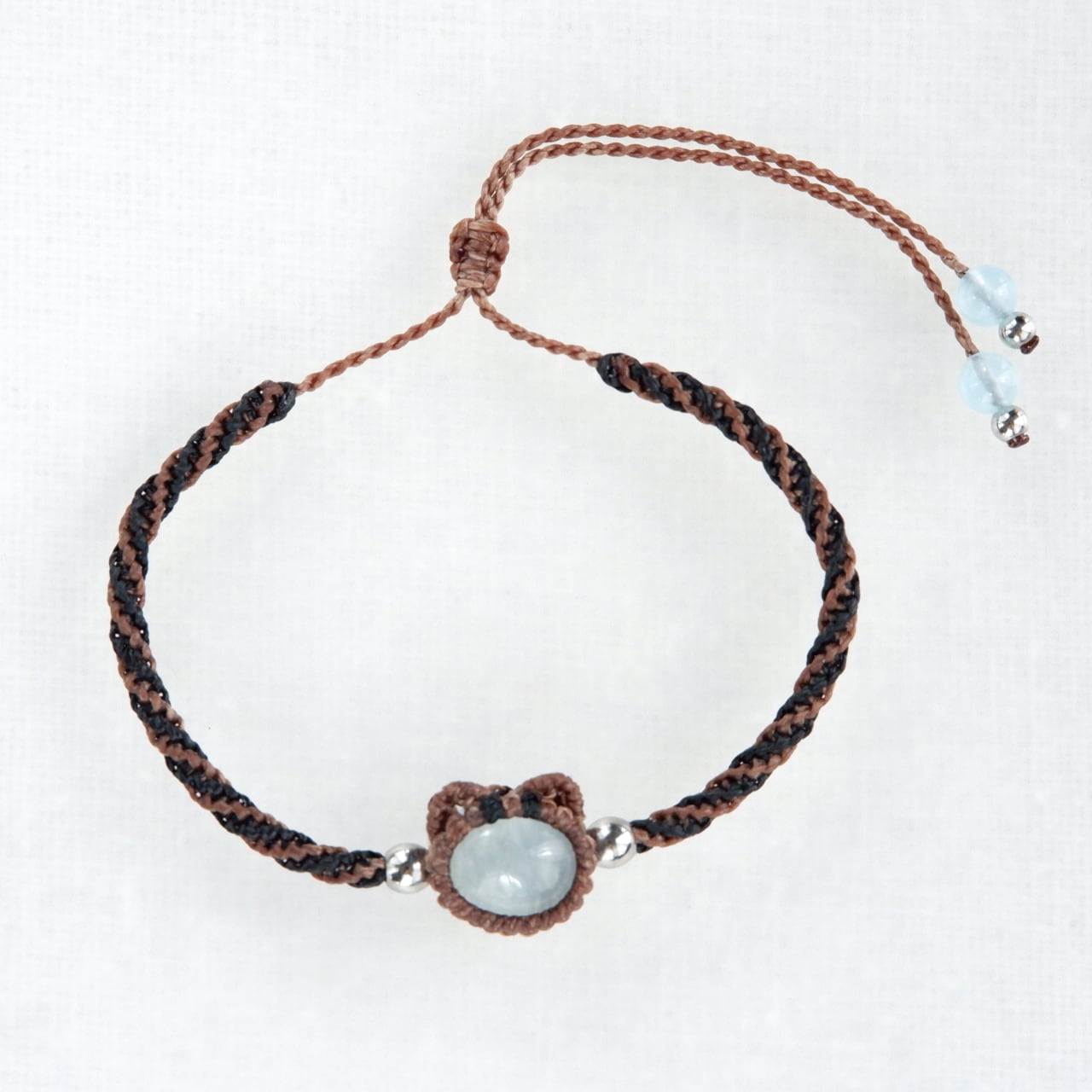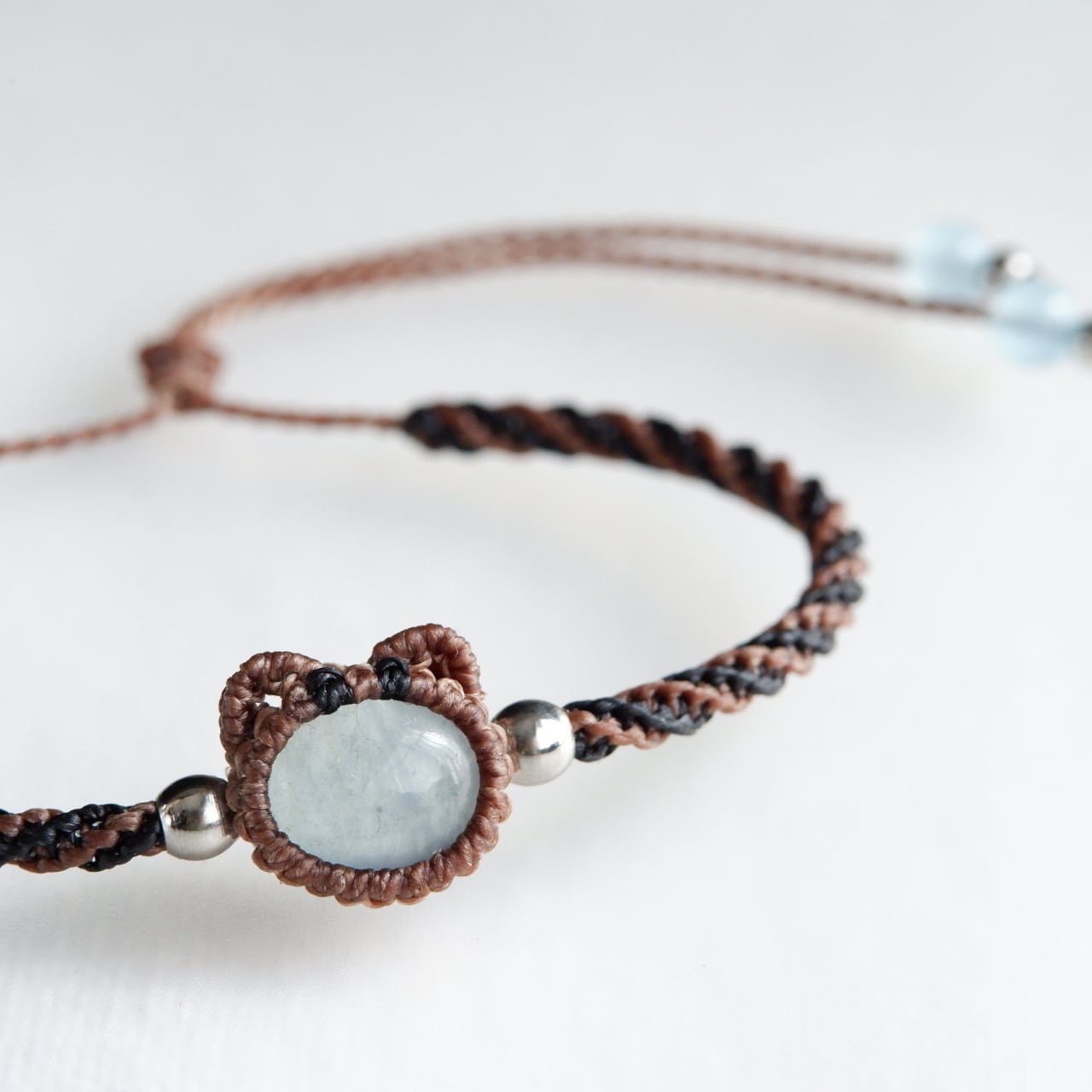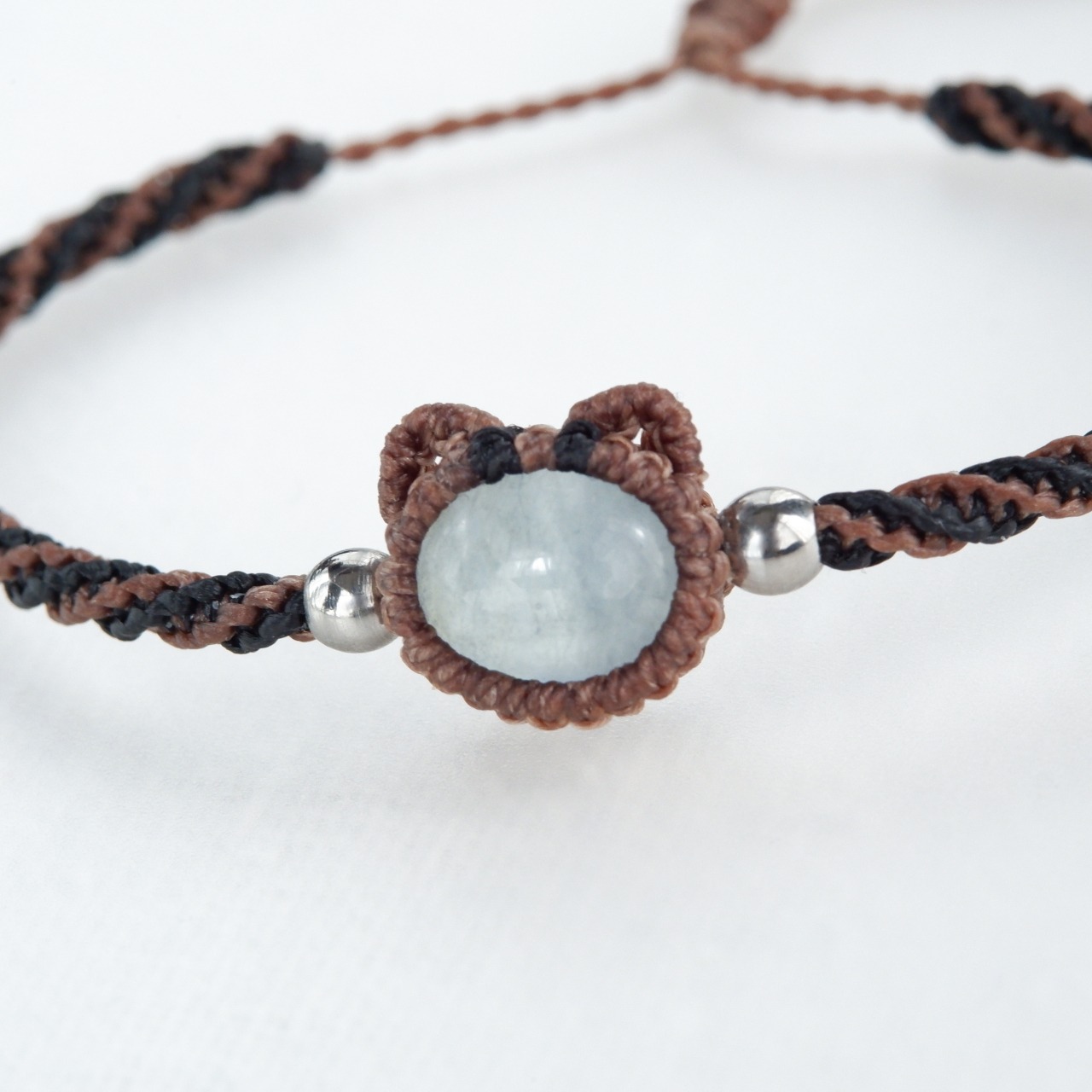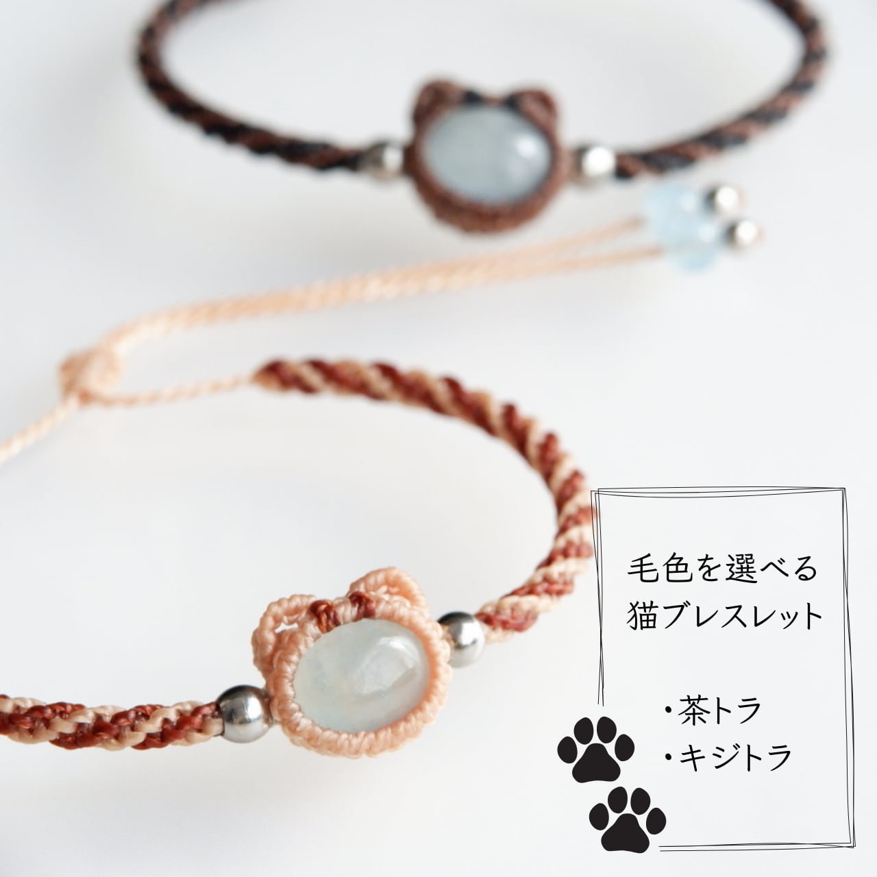 毛色が選べる 猫ブレスレット|3月誕生石:アクアマリン|受注制作|茶トラ|キジトラ|マクラメ編み 猫アクセサリー